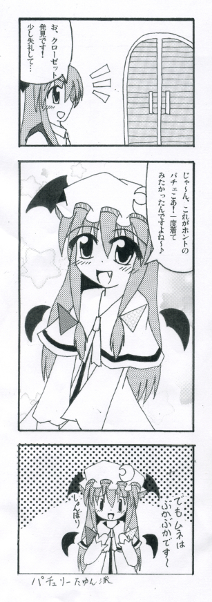 自分は今回4コマを描いてみました。3ページほど。↑の画像はそのサンプルになります(これは3コマなのですが…)。緋想天やら地霊殿やらでパチュリーが出張中の間、小悪魔は何をしているのか?というような話を描いてみました。4コマ初挑戦でなかなか難しいところもありましたが、それ以上に楽しく描くことができました。